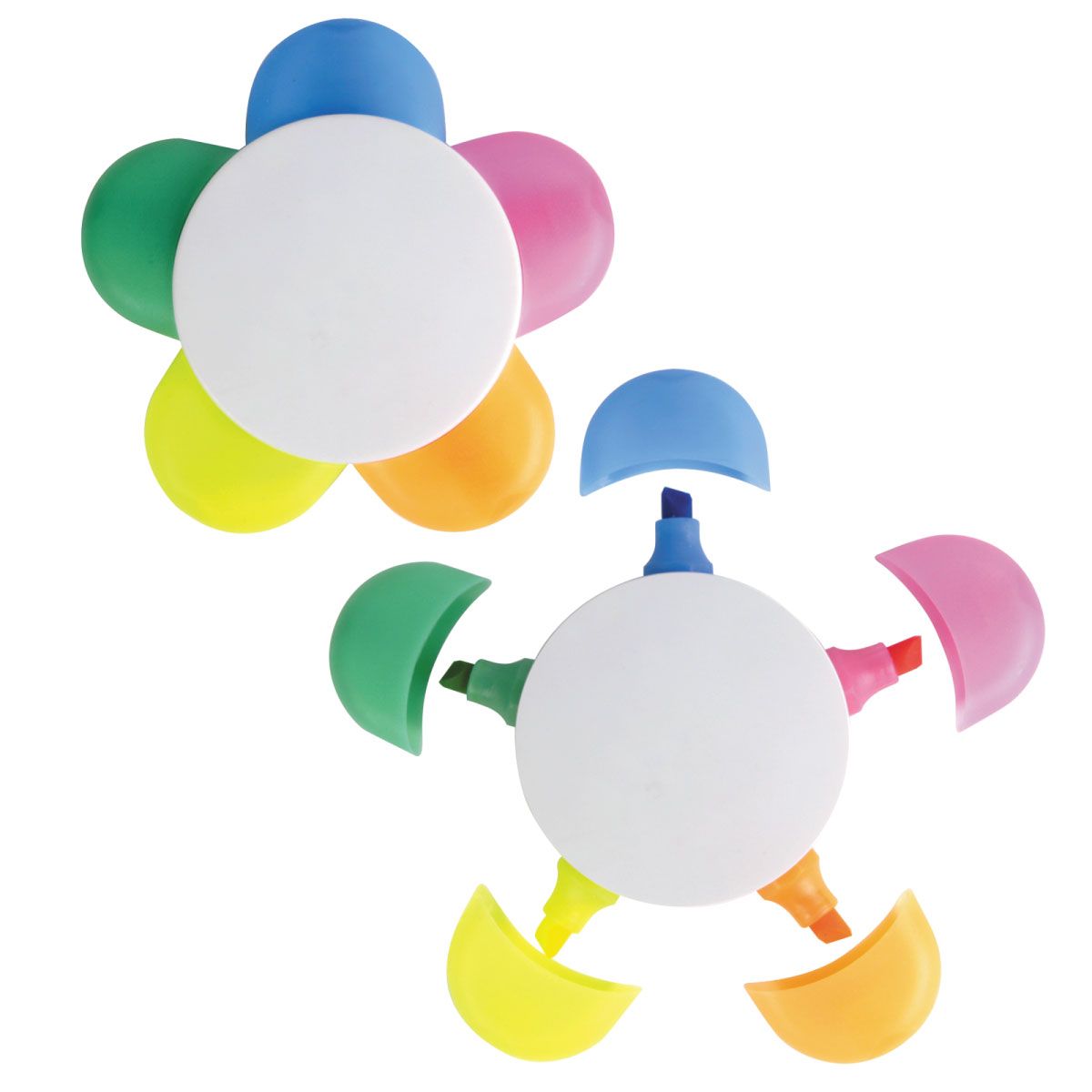 This colourful Flower Highlighter will be a great study companion. It has a white centre with pink, orange, yellow, green and blue chisel shaped fluorescent highlight colours with matching caps.