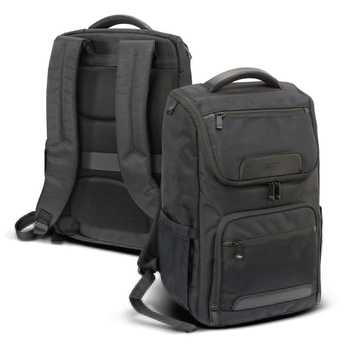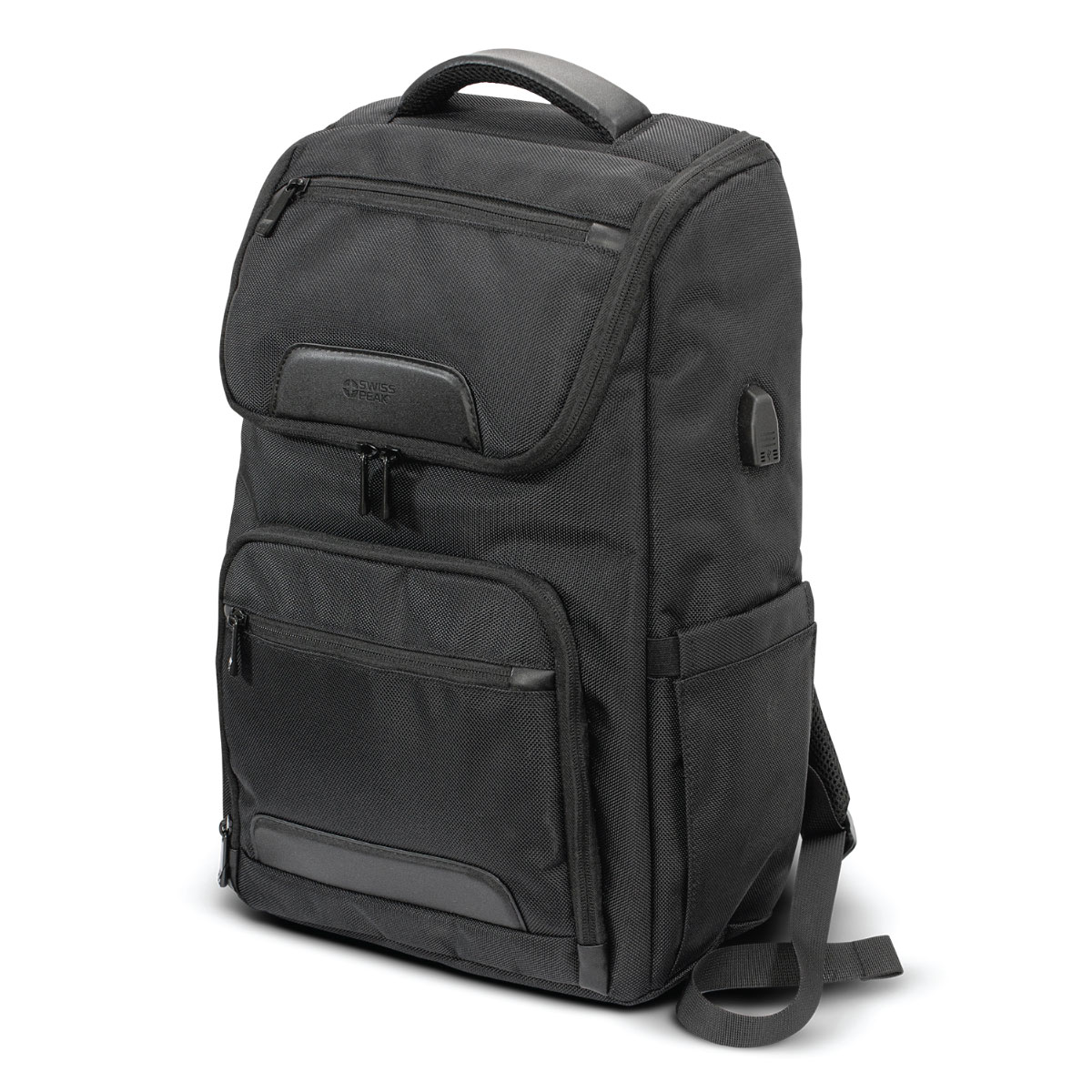 The Swiss Peak Voyager Laptop Backpacks will make your daily commute easier and keep your devices safe. It is manufactured from premium 1680D polyester fabric with smart PU accents and 210D polyester lining. The large main compartment has a zip-around closure and includes a padded pocket that will comfortably hold a 15-inch laptop, two slip pockets that offer RIFD protection and a USB outlet. The back of the backpack is heavily padded for extra comfort and the padded shoulder straps are fully adjustable. Other features include two side pockets with elastic openings to hold water bottles and other accessories, three external zippered pockets, a padded carry handle and a rear luggage sleeve that slides over the handle of a rolling suitcase. The Swiss Peak logo is subtly debossed on the front of the bag and branded on the laptop pocket.